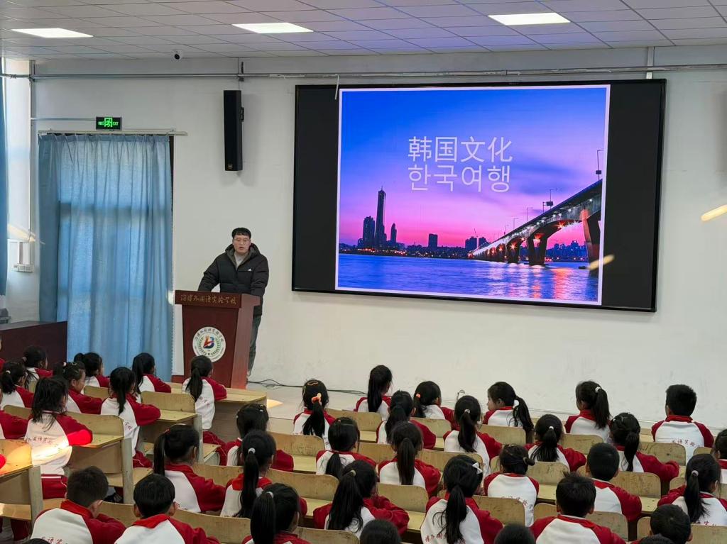 为充分激活优质教育资源,深化 “六共” 协同育人模式,助力附属学校打造国际化教育特色,推动高质量发展迈上新台阶,近日,国际教育系邀请外语系教师刘政共同走进淄博外国语实验学校,为学子们带来 “环球视野・留学教师微课堂” 系列活动第三期— 韩国文化专题分享。课堂以丰富的知识内涵与趣味互动,带领学生沉浸式感受韩国文化的独特魅力,为跨文化交流与协同育人注入新动能。